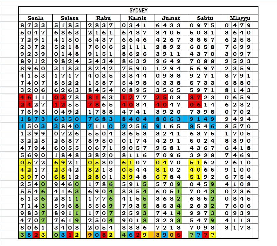 Perhatian! Data Paito Warna Sydney Diambil dari website livedraw : disini. Jika ada kekeliruan data didalam paito, harap merujuk ke sumber asli masing-masing game.