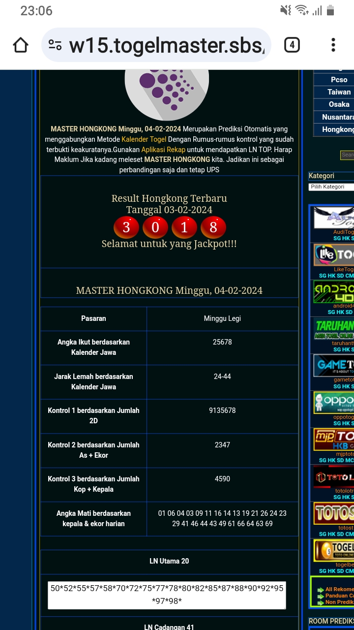 MASTER HONGKONG Selasa, 03-03-2026 Merupakan Prediksi Otomatis yang menggabungkan Metode Kalender Togel Dengan Rumus-rumus kontrol yang sudah terbukti keakuratanya.Gunakan Aplikasi Rekap untuk mendapatkan LN TOP. Harap Maklum Jika kadang meleset MASTER HONGKONG kita. Jadikan ini sebagai perbandingan saja dan tetap UPS