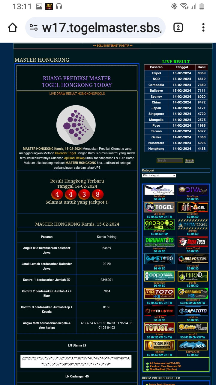 MASTER HONGKONG Selasa, 03-03-2026 Merupakan Prediksi Otomatis yang menggabungkan Metode Kalender Togel Dengan Rumus-rumus kontrol yang sudah terbukti keakuratanya.Gunakan Aplikasi Rekap untuk mendapatkan LN TOP. Harap Maklum Jika kadang meleset MASTER HONGKONG kita. Jadikan ini sebagai perbandingan saja dan tetap UPS