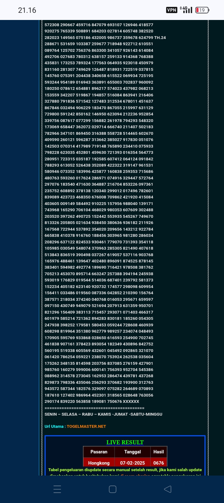 MASTER HONGKONG Kamis, 26-02-2026 Merupakan Prediksi Otomatis yang menggabungkan Metode Kalender Togel Dengan Rumus-rumus kontrol yang sudah terbukti keakuratanya.Gunakan Aplikasi Rekap untuk mendapatkan LN TOP. Harap Maklum Jika kadang meleset MASTER HONGKONG kita. Jadikan ini sebagai perbandingan saja dan tetap UPS
