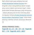 semua postingan komentar SARA, politik, saling menghujat serta saling merendahkan antara prediktor satu dengan yang lainnya jika kami lagi OL mohon maaf langsung kami hapus dan jika telah diperingatkan masih mengulang kami lock datanya