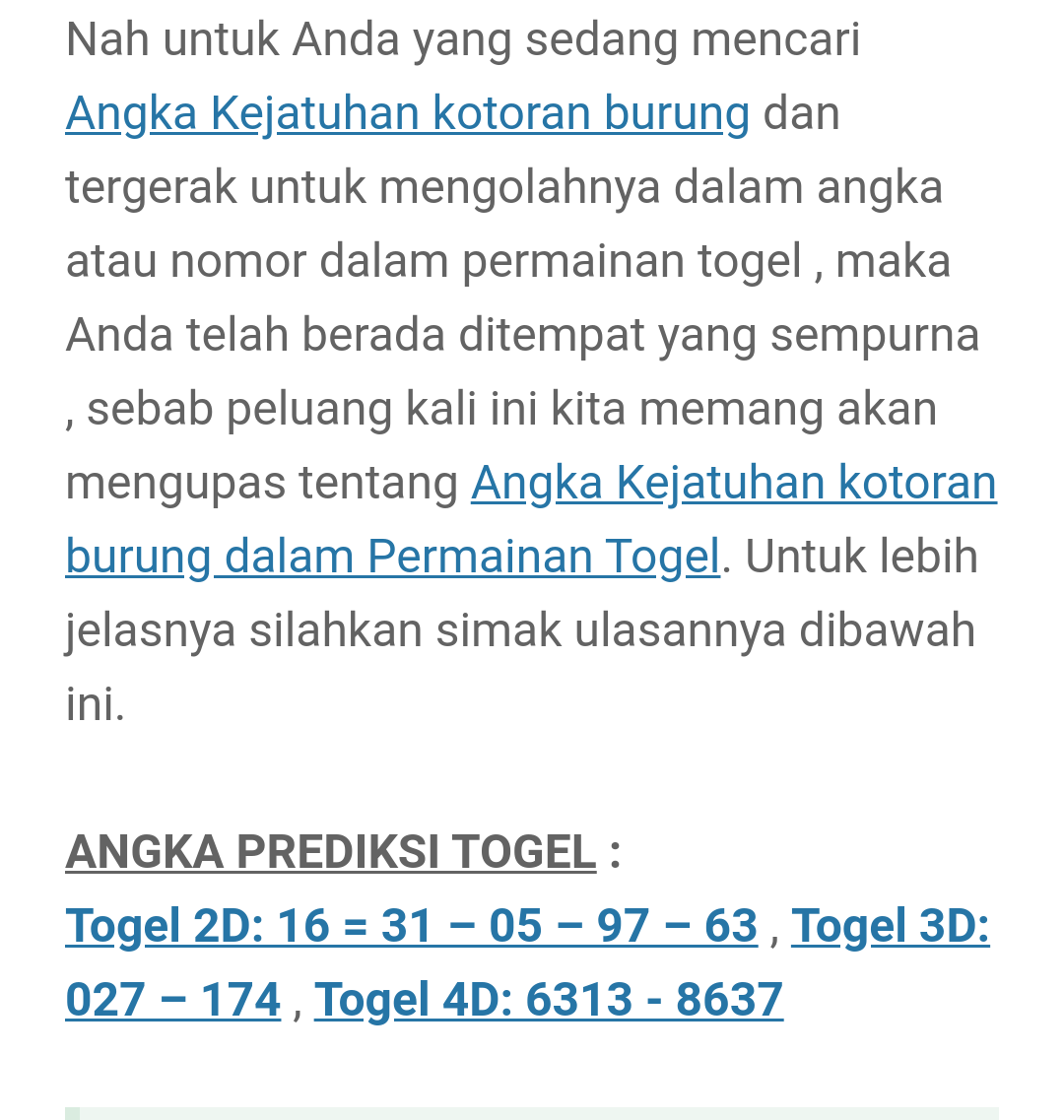 Prediksi Ini Berubah secara otomatis sesuai hari dan result pasaran masing-masing. Untuk melihat prediksi sebelumnya klik tombol nomor hitam diatas