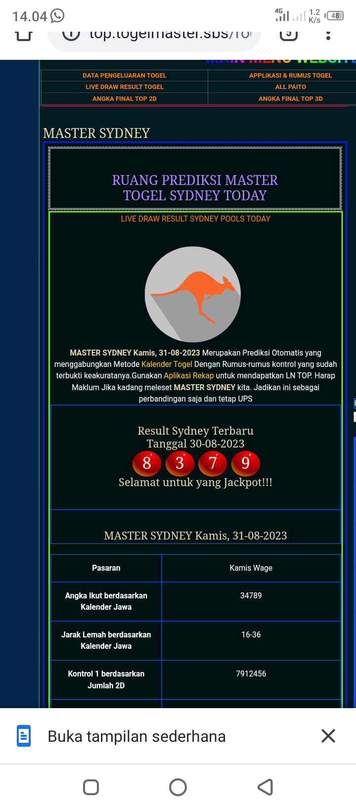 MASTER SYDNEY Senin, 02-03-2026 Merupakan Prediksi Otomatis yang menggabungkan Metode Kalender Togel Dengan Rumus-rumus kontrol yang sudah terbukti keakuratanya.Gunakan Aplikasi Rekap untuk mendapatkan LN TOP. Harap Maklum Jika kadang meleset MASTER SYDNEY kita. Jadikan ini sebagai perbandingan saja dan tetap UPS
