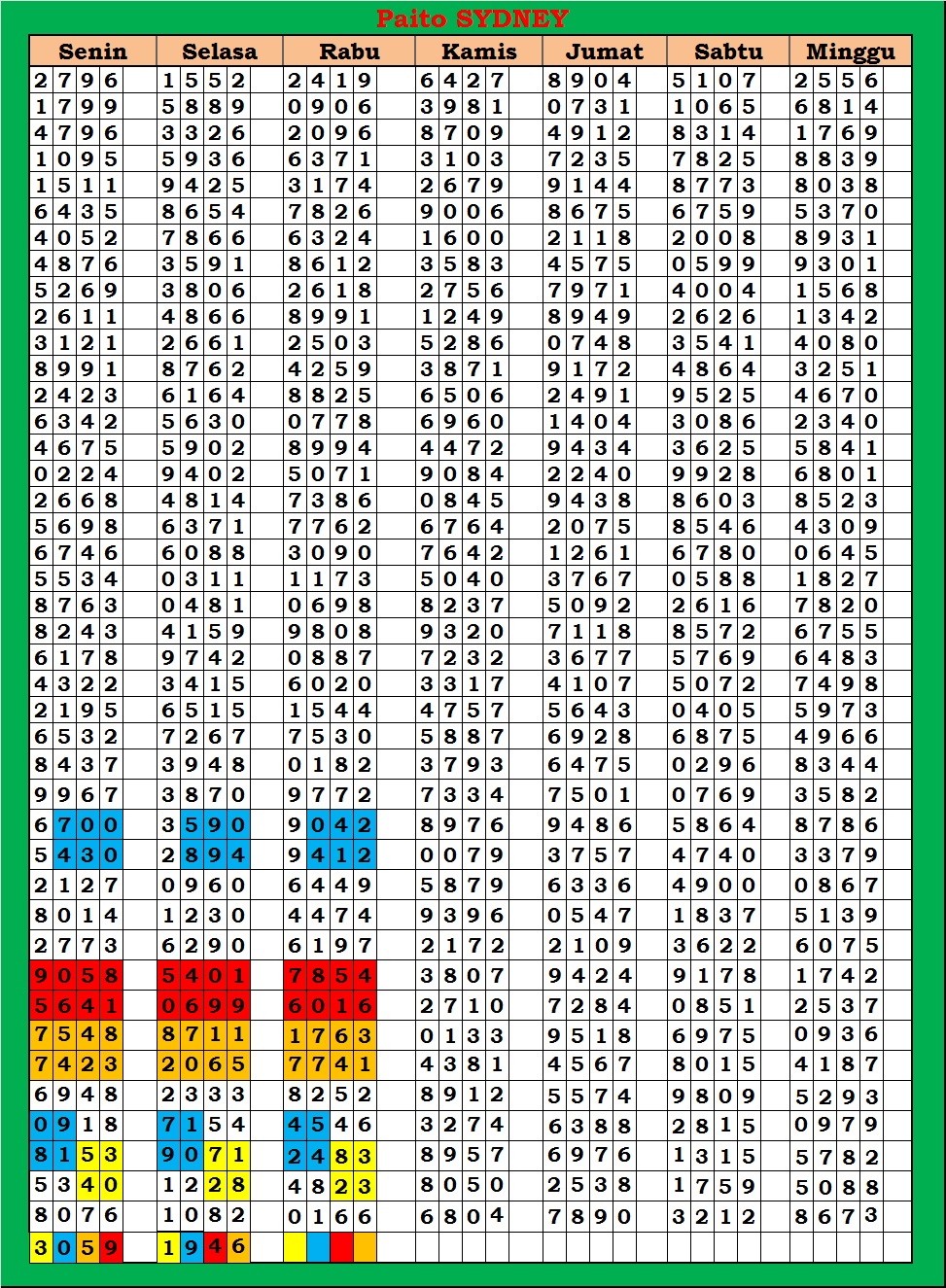 | PAITO WARNA SYDNEY 4D HARIAN |