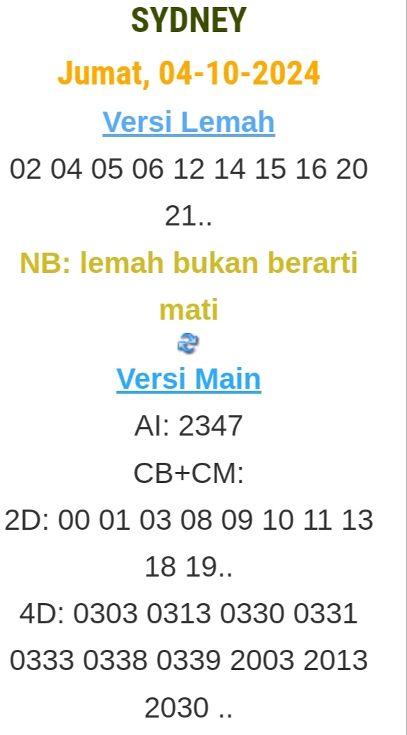| PAITO WARNA SYDNEY 4D HARIAN |