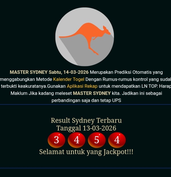 MASTER SYDNEY Senin, 13-04-2026 Merupakan Prediksi Otomatis yang menggabungkan Metode Kalender Togel Dengan Rumus-rumus kontrol yang sudah terbukti keakuratanya.Gunakan Aplikasi Rekap untuk mendapatkan LN TOP. Harap Maklum Jika kadang meleset MASTER SYDNEY kita. Jadikan ini sebagai perbandingan saja dan tetap UPS