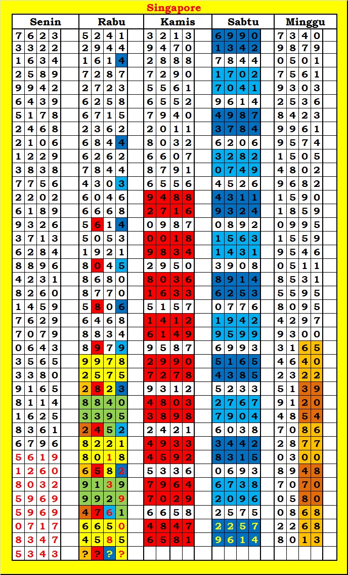 MASTER SINGAPURA Senin, 02-03-2026 Merupakan Prediksi Otomatis yang menggabungkan Metode Kalender Togel Dengan Rumus-rumus kontrol yang sudah terbukti keakuratanya.Gunakan Aplikasi Rekap untuk mendapatkan LN TOP. Harap Maklum Jika kadang meleset MASTER SINGAPURA kita. Jadikan ini sebagai perbandingan saja dan tetap UPS