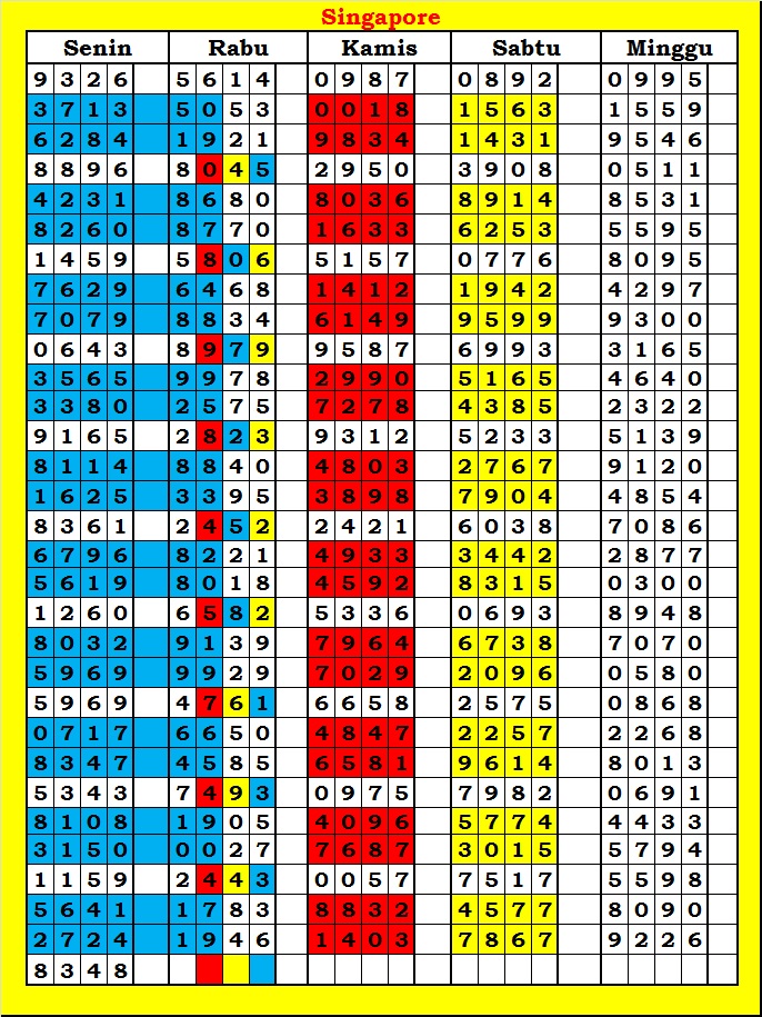 MASTER SINGAPURA Senin, 02-03-2026 Merupakan Prediksi Otomatis yang menggabungkan Metode Kalender Togel Dengan Rumus-rumus kontrol yang sudah terbukti keakuratanya.Gunakan Aplikasi Rekap untuk mendapatkan LN TOP. Harap Maklum Jika kadang meleset MASTER SINGAPURA kita. Jadikan ini sebagai perbandingan saja dan tetap UPS