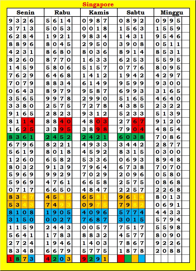 MASTER SINGAPURA Senin, 02-03-2026 Merupakan Prediksi Otomatis yang menggabungkan Metode Kalender Togel Dengan Rumus-rumus kontrol yang sudah terbukti keakuratanya.Gunakan Aplikasi Rekap untuk mendapatkan LN TOP. Harap Maklum Jika kadang meleset MASTER SINGAPURA kita. Jadikan ini sebagai perbandingan saja dan tetap UPS