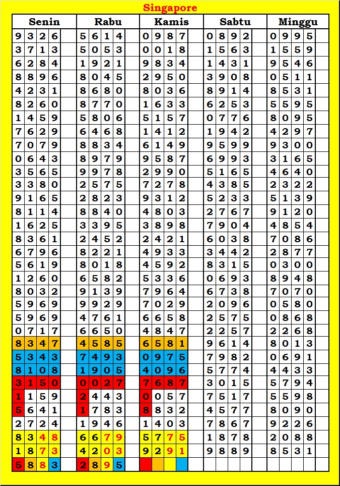 MASTER SINGAPURA Senin, 02-03-2026 Merupakan Prediksi Otomatis yang menggabungkan Metode Kalender Togel Dengan Rumus-rumus kontrol yang sudah terbukti keakuratanya.Gunakan Aplikasi Rekap untuk mendapatkan LN TOP. Harap Maklum Jika kadang meleset MASTER SINGAPURA kita. Jadikan ini sebagai perbandingan saja dan tetap UPS