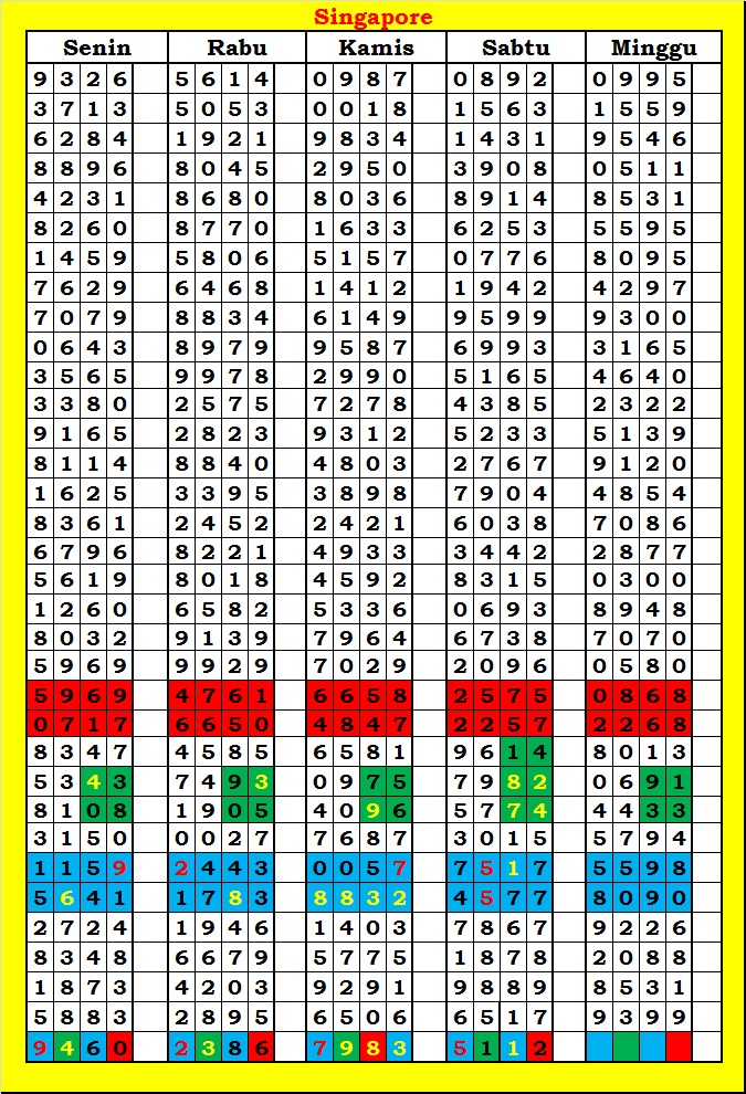 MASTER SINGAPURA Senin, 02-03-2026 Merupakan Prediksi Otomatis yang menggabungkan Metode Kalender Togel Dengan Rumus-rumus kontrol yang sudah terbukti keakuratanya.Gunakan Aplikasi Rekap untuk mendapatkan LN TOP. Harap Maklum Jika kadang meleset MASTER SINGAPURA kita. Jadikan ini sebagai perbandingan saja dan tetap UPS