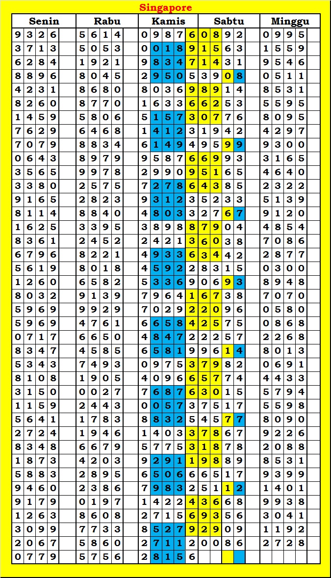 MASTER SINGAPURA Minggu, 01-03-2026 Merupakan Prediksi Otomatis yang menggabungkan Metode Kalender Togel Dengan Rumus-rumus kontrol yang sudah terbukti keakuratanya.Gunakan Aplikasi Rekap untuk mendapatkan LN TOP. Harap Maklum Jika kadang meleset MASTER SINGAPURA kita. Jadikan ini sebagai perbandingan saja dan tetap UPS