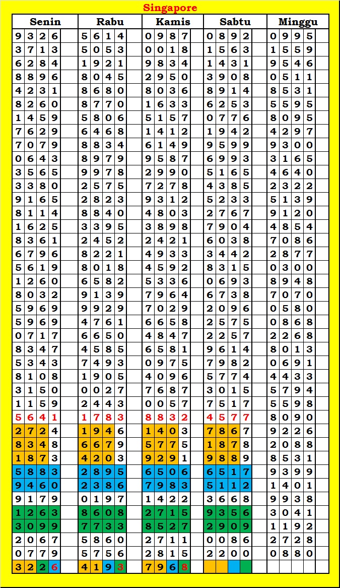 MASTER SINGAPURA Minggu, 01-03-2026 Merupakan Prediksi Otomatis yang menggabungkan Metode Kalender Togel Dengan Rumus-rumus kontrol yang sudah terbukti keakuratanya.Gunakan Aplikasi Rekap untuk mendapatkan LN TOP. Harap Maklum Jika kadang meleset MASTER SINGAPURA kita. Jadikan ini sebagai perbandingan saja dan tetap UPS