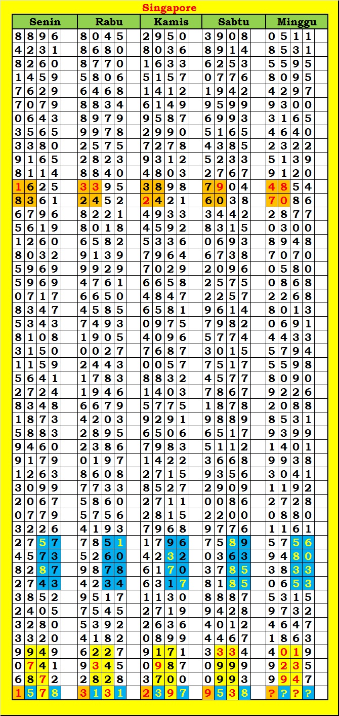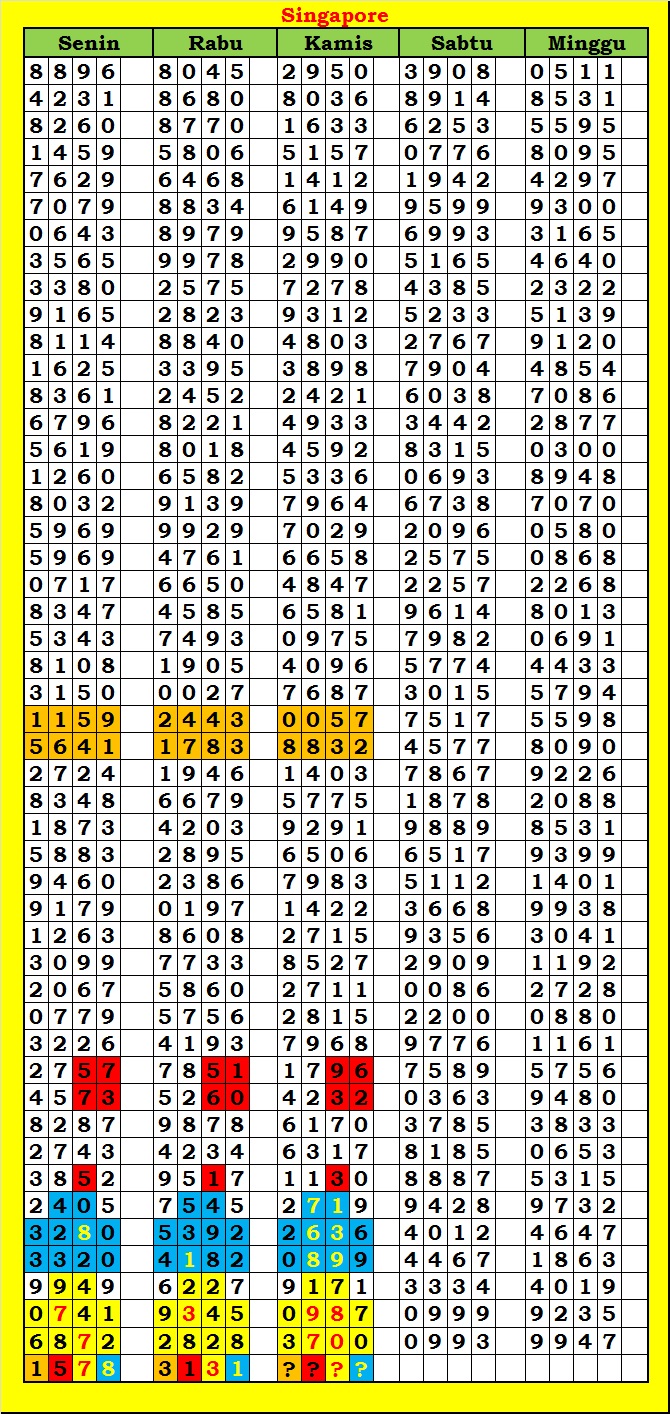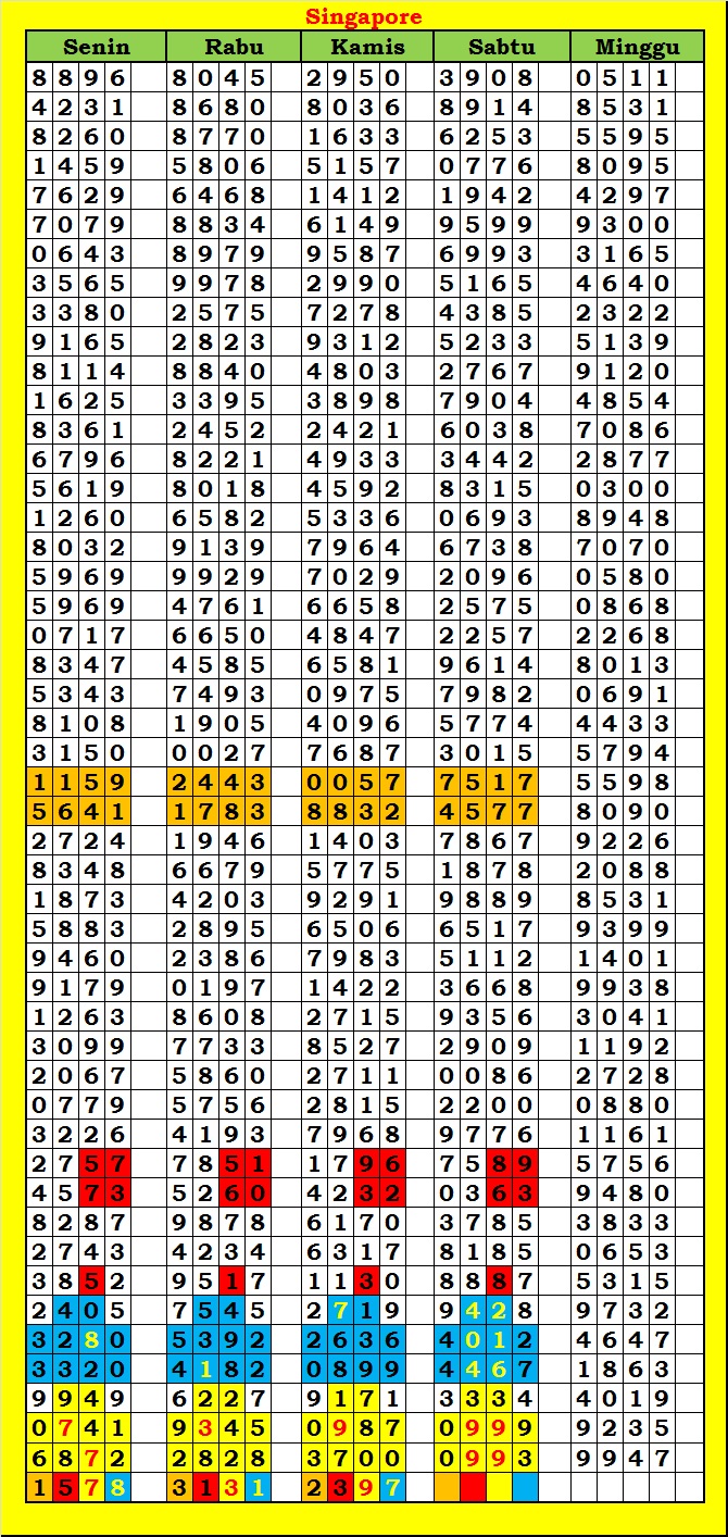 MASTER SINGAPURA Sabtu, 28-02-2026 Merupakan Prediksi Otomatis yang menggabungkan Metode Kalender Togel Dengan Rumus-rumus kontrol yang sudah terbukti keakuratanya.Gunakan Aplikasi Rekap untuk mendapatkan LN TOP. Harap Maklum Jika kadang meleset MASTER SINGAPURA kita. Jadikan ini sebagai perbandingan saja dan tetap UPS