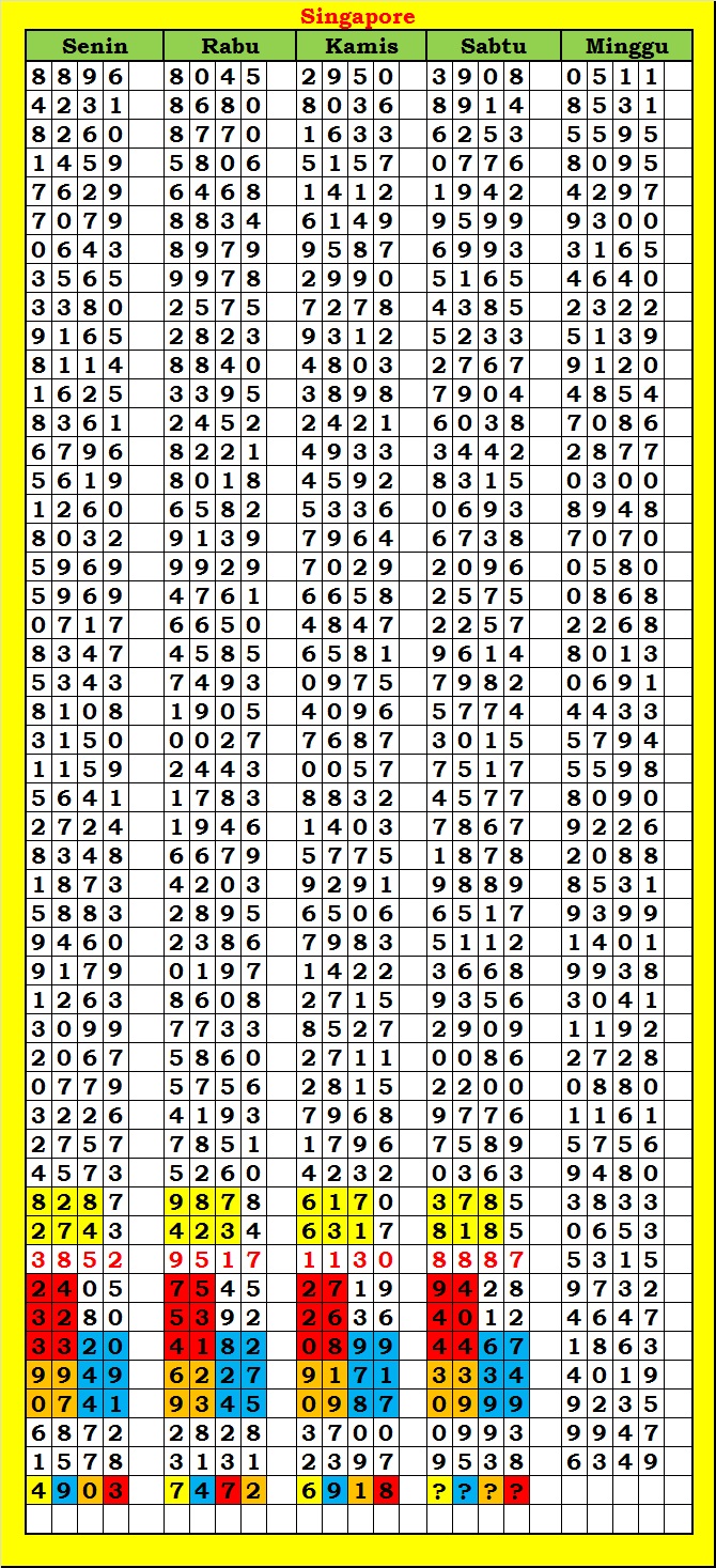 MASTER SINGAPURA Sabtu, 28-02-2026 Merupakan Prediksi Otomatis yang menggabungkan Metode Kalender Togel Dengan Rumus-rumus kontrol yang sudah terbukti keakuratanya.Gunakan Aplikasi Rekap untuk mendapatkan LN TOP. Harap Maklum Jika kadang meleset MASTER SINGAPURA kita. Jadikan ini sebagai perbandingan saja dan tetap UPS