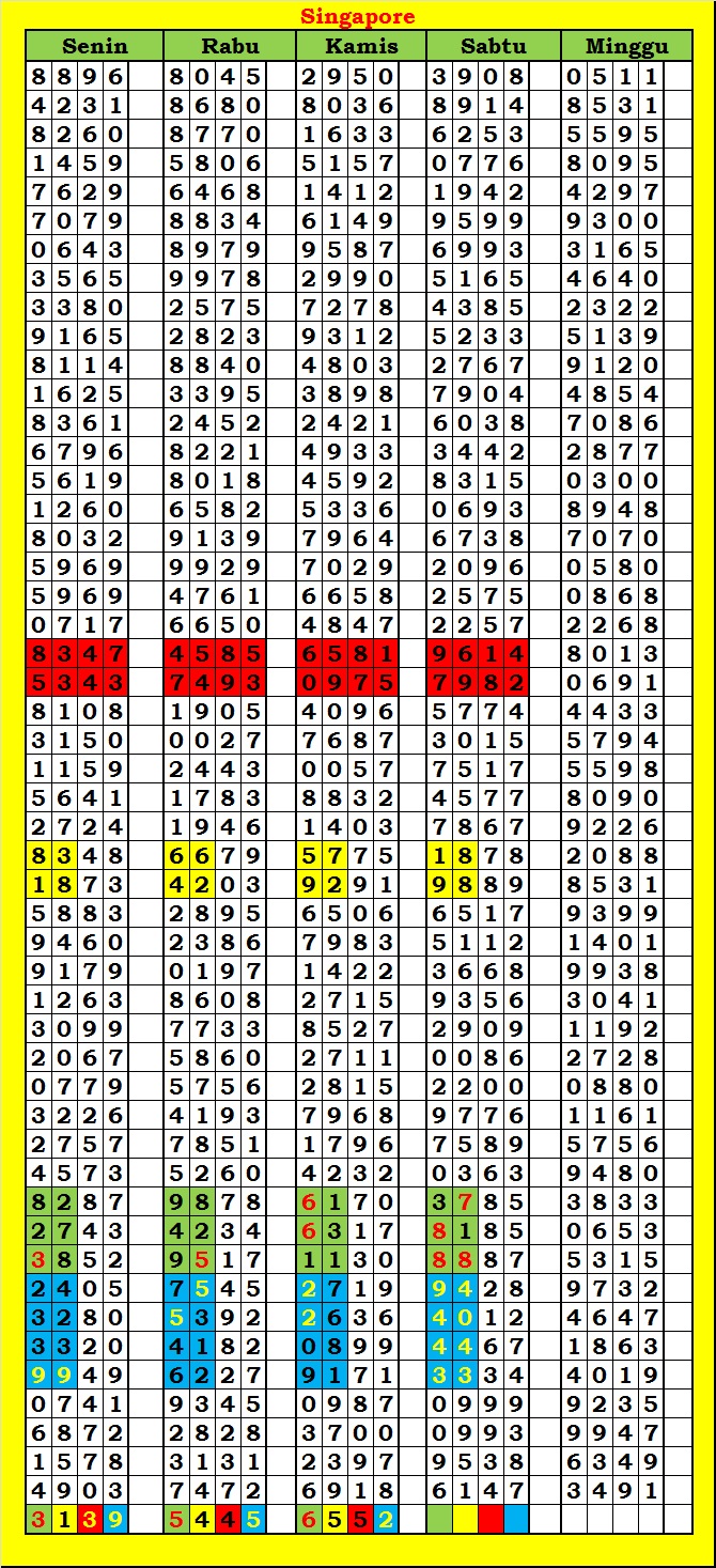 MASTER SINGAPURA Sabtu, 28-02-2026 Merupakan Prediksi Otomatis yang menggabungkan Metode Kalender Togel Dengan Rumus-rumus kontrol yang sudah terbukti keakuratanya.Gunakan Aplikasi Rekap untuk mendapatkan LN TOP. Harap Maklum Jika kadang meleset MASTER SINGAPURA kita. Jadikan ini sebagai perbandingan saja dan tetap UPS