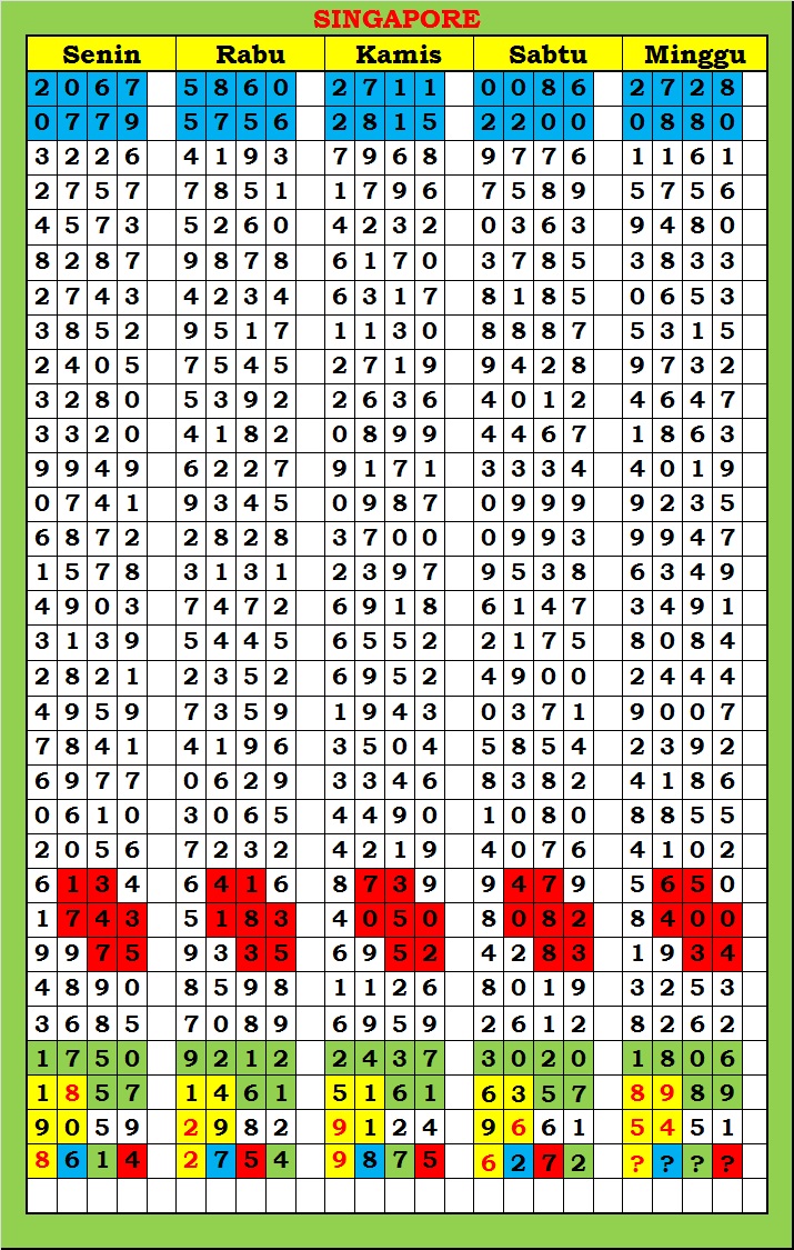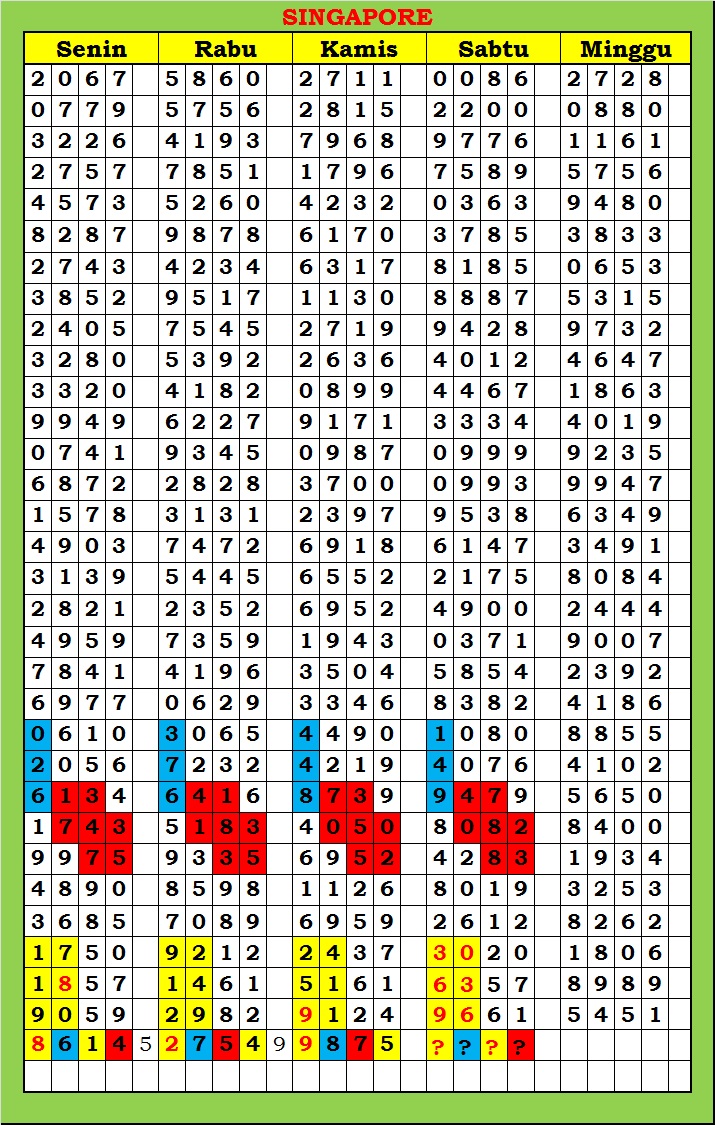 MASTER SINGAPURA Kamis, 26-02-2026 Merupakan Prediksi Otomatis yang menggabungkan Metode Kalender Togel Dengan Rumus-rumus kontrol yang sudah terbukti keakuratanya.Gunakan Aplikasi Rekap untuk mendapatkan LN TOP. Harap Maklum Jika kadang meleset MASTER SINGAPURA kita. Jadikan ini sebagai perbandingan saja dan tetap UPS