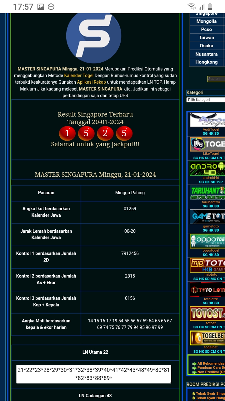 MASTER SINGAPURA Kamis, 26-02-2026 Merupakan Prediksi Otomatis yang menggabungkan Metode Kalender Togel Dengan Rumus-rumus kontrol yang sudah terbukti keakuratanya.Gunakan Aplikasi Rekap untuk mendapatkan LN TOP. Harap Maklum Jika kadang meleset MASTER SINGAPURA kita. Jadikan ini sebagai perbandingan saja dan tetap UPS