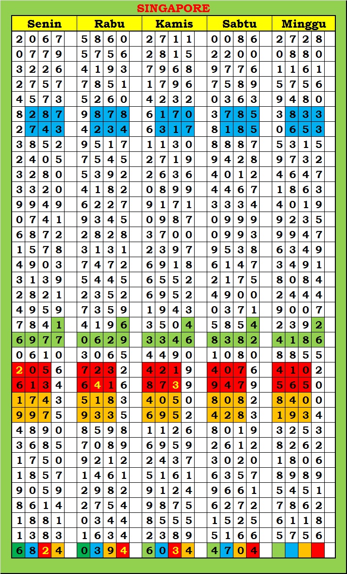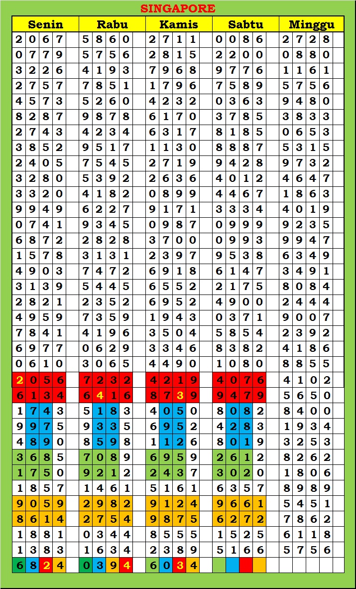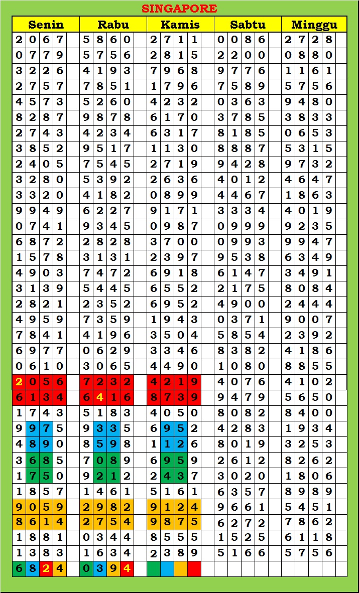 MASTER SINGAPURA Kamis, 26-02-2026 Merupakan Prediksi Otomatis yang menggabungkan Metode Kalender Togel Dengan Rumus-rumus kontrol yang sudah terbukti keakuratanya.Gunakan Aplikasi Rekap untuk mendapatkan LN TOP. Harap Maklum Jika kadang meleset MASTER SINGAPURA kita. Jadikan ini sebagai perbandingan saja dan tetap UPS