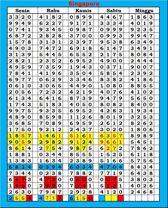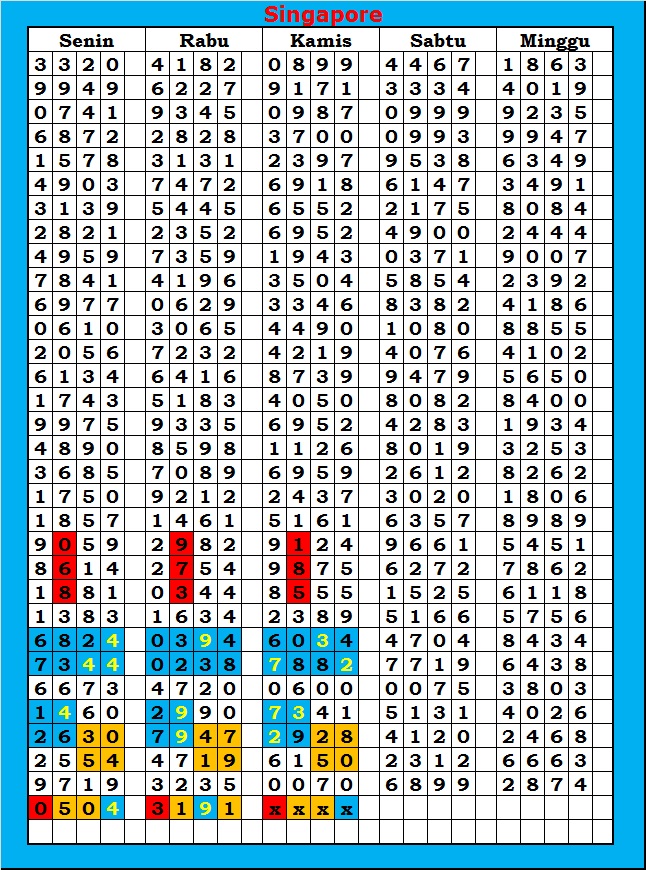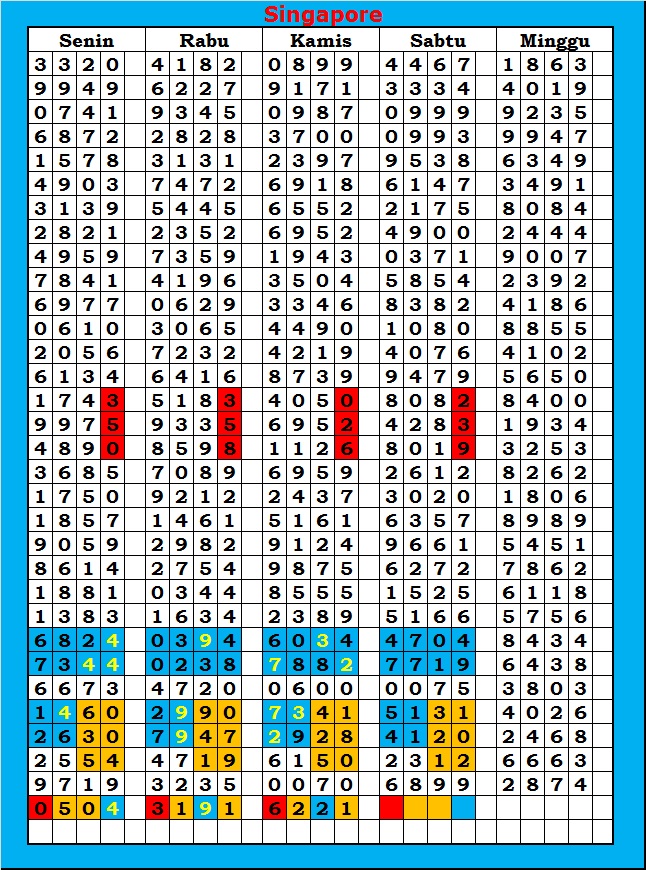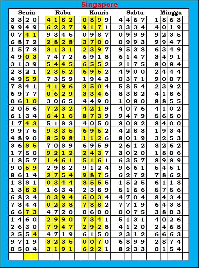MASTER SINGAPURA Kamis, 26-02-2026 Merupakan Prediksi Otomatis yang menggabungkan Metode Kalender Togel Dengan Rumus-rumus kontrol yang sudah terbukti keakuratanya.Gunakan Aplikasi Rekap untuk mendapatkan LN TOP. Harap Maklum Jika kadang meleset MASTER SINGAPURA kita. Jadikan ini sebagai perbandingan saja dan tetap UPS