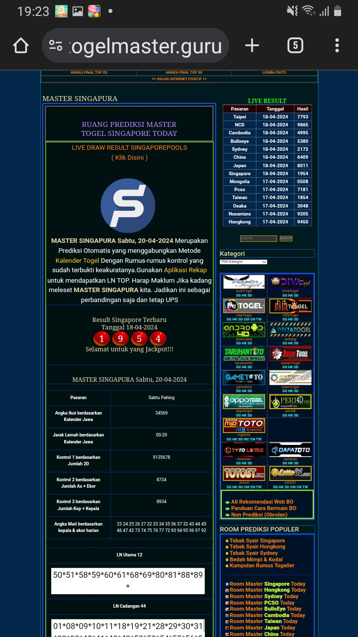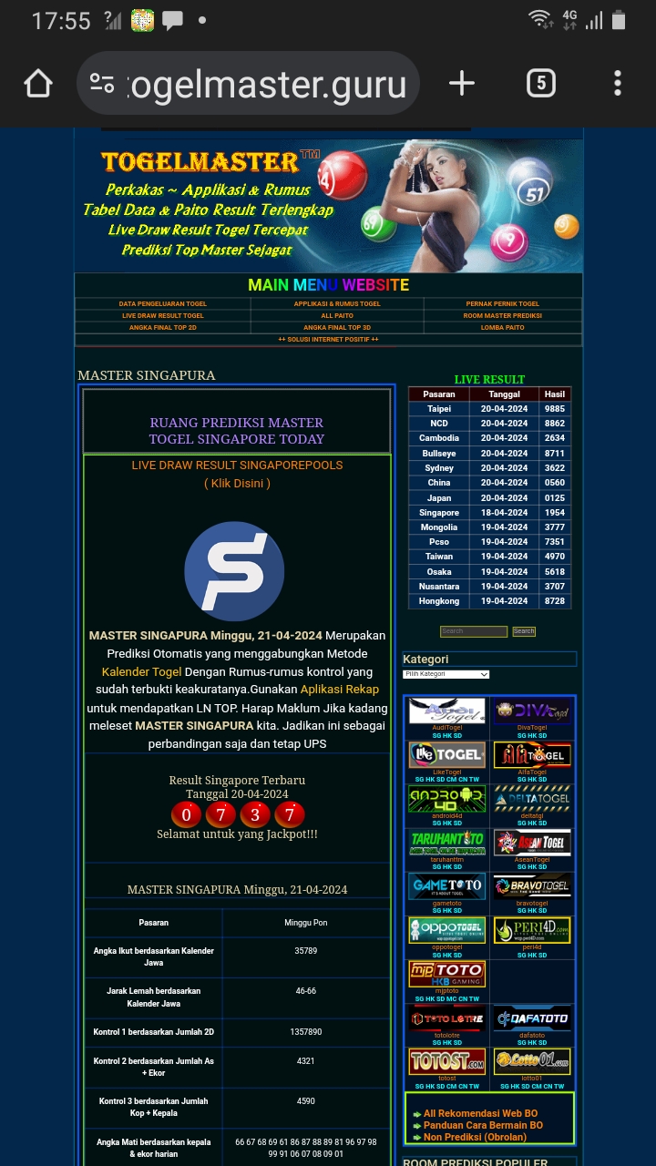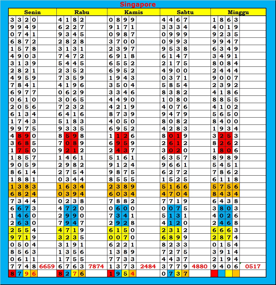 MASTER SINGAPURA Kamis, 26-02-2026 Merupakan Prediksi Otomatis yang menggabungkan Metode Kalender Togel Dengan Rumus-rumus kontrol yang sudah terbukti keakuratanya.Gunakan Aplikasi Rekap untuk mendapatkan LN TOP. Harap Maklum Jika kadang meleset MASTER SINGAPURA kita. Jadikan ini sebagai perbandingan saja dan tetap UPS