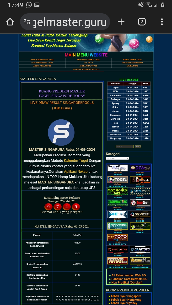 MASTER SINGAPURA Kamis, 26-02-2026 Merupakan Prediksi Otomatis yang menggabungkan Metode Kalender Togel Dengan Rumus-rumus kontrol yang sudah terbukti keakuratanya.Gunakan Aplikasi Rekap untuk mendapatkan LN TOP. Harap Maklum Jika kadang meleset MASTER SINGAPURA kita. Jadikan ini sebagai perbandingan saja dan tetap UPS
