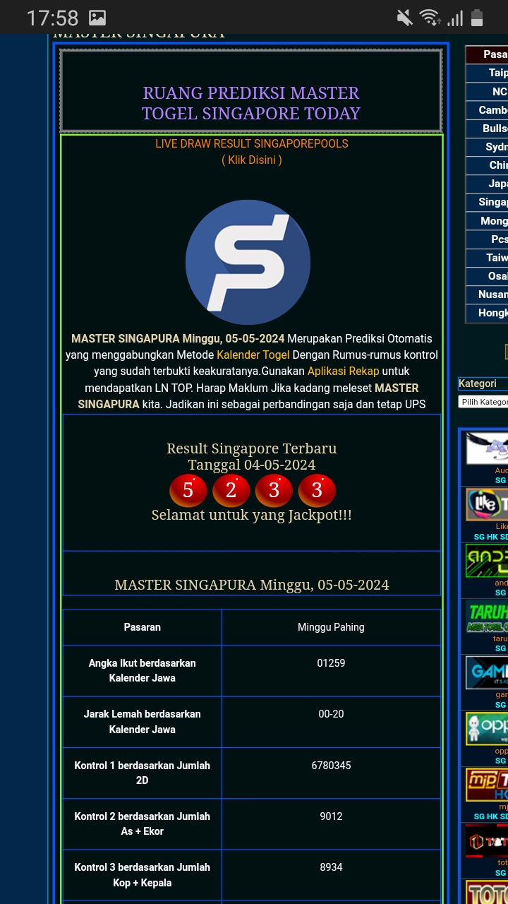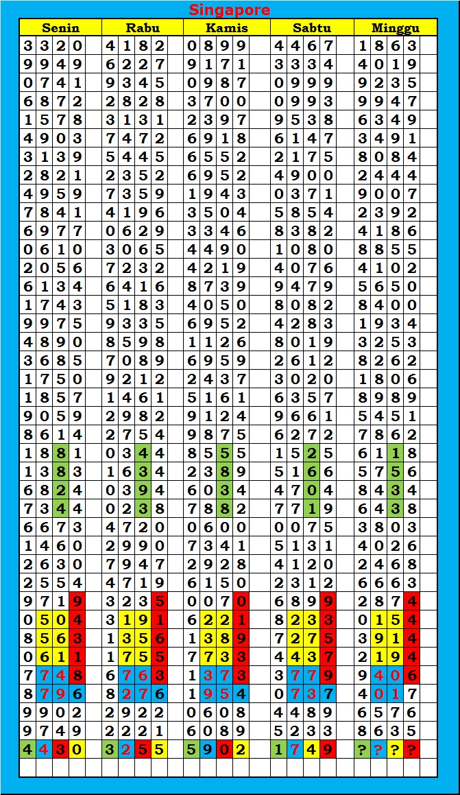 MASTER SINGAPURA Kamis, 26-02-2026 Merupakan Prediksi Otomatis yang menggabungkan Metode Kalender Togel Dengan Rumus-rumus kontrol yang sudah terbukti keakuratanya.Gunakan Aplikasi Rekap untuk mendapatkan LN TOP. Harap Maklum Jika kadang meleset MASTER SINGAPURA kita. Jadikan ini sebagai perbandingan saja dan tetap UPS