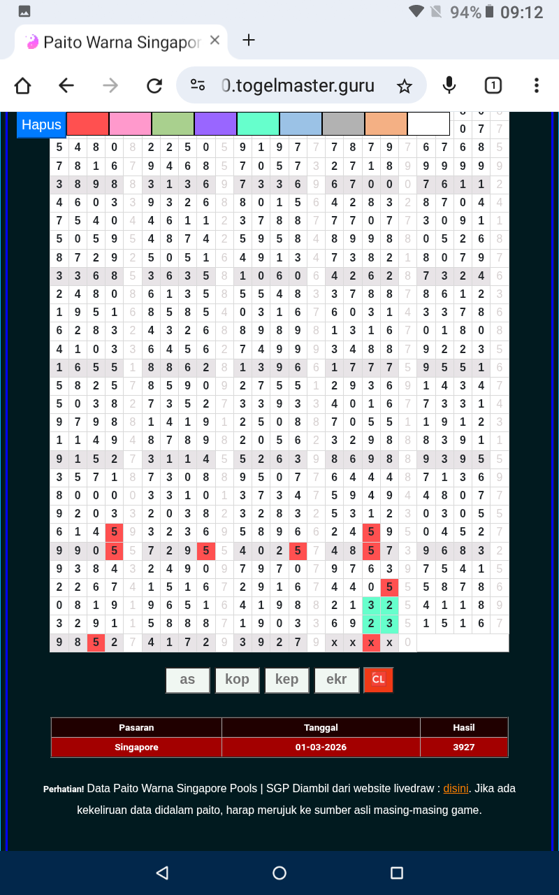 MASTER SINGAPURA Senin, 13-04-2026 Merupakan Prediksi Otomatis yang menggabungkan Metode Kalender Togel Dengan Rumus-rumus kontrol yang sudah terbukti keakuratanya.Gunakan Aplikasi Rekap untuk mendapatkan LN TOP. Harap Maklum Jika kadang meleset MASTER SINGAPURA kita. Jadikan ini sebagai perbandingan saja dan tetap UPS